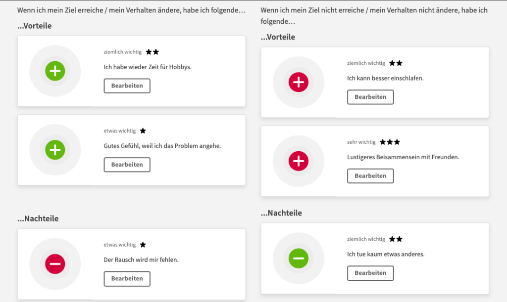 Die Motivationswaage hilft dabei, sich bewusst zu machen, welche positiven und negativen Aspekte mit dem eigenen Konsum verbunden sind und Vor- und Nachteile gegeneinander abzuwiegen: Was motiviert mich zum Konsum? Was hält mich von einer Abstinenz ab? Welche Faktoren sprechen dafür, mein Verhalten zu ändern?