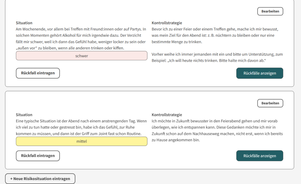 Das Tool „Risikosituationen und Kontrollstrategien“ unterstützt dabei, sich mit den persönlichen Risikosituationen auseinanderzusetzen und geeignete Strategien zu erarbeiten. Sollten Rückfälle passieren, können diese dokumentiert und die Strategien überarbeitet werden.