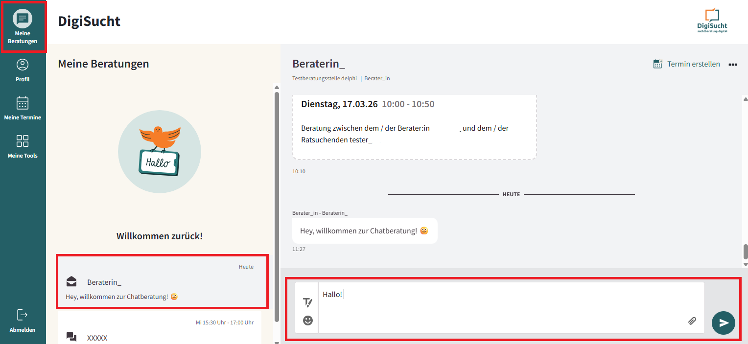 Nachrichten und Text-Chats finden bei DigiSucht in demselben Chat-Fenster statt – ähnlich wie bei bekannten Messenger-Diensten wie Whatsapp oder Signal.