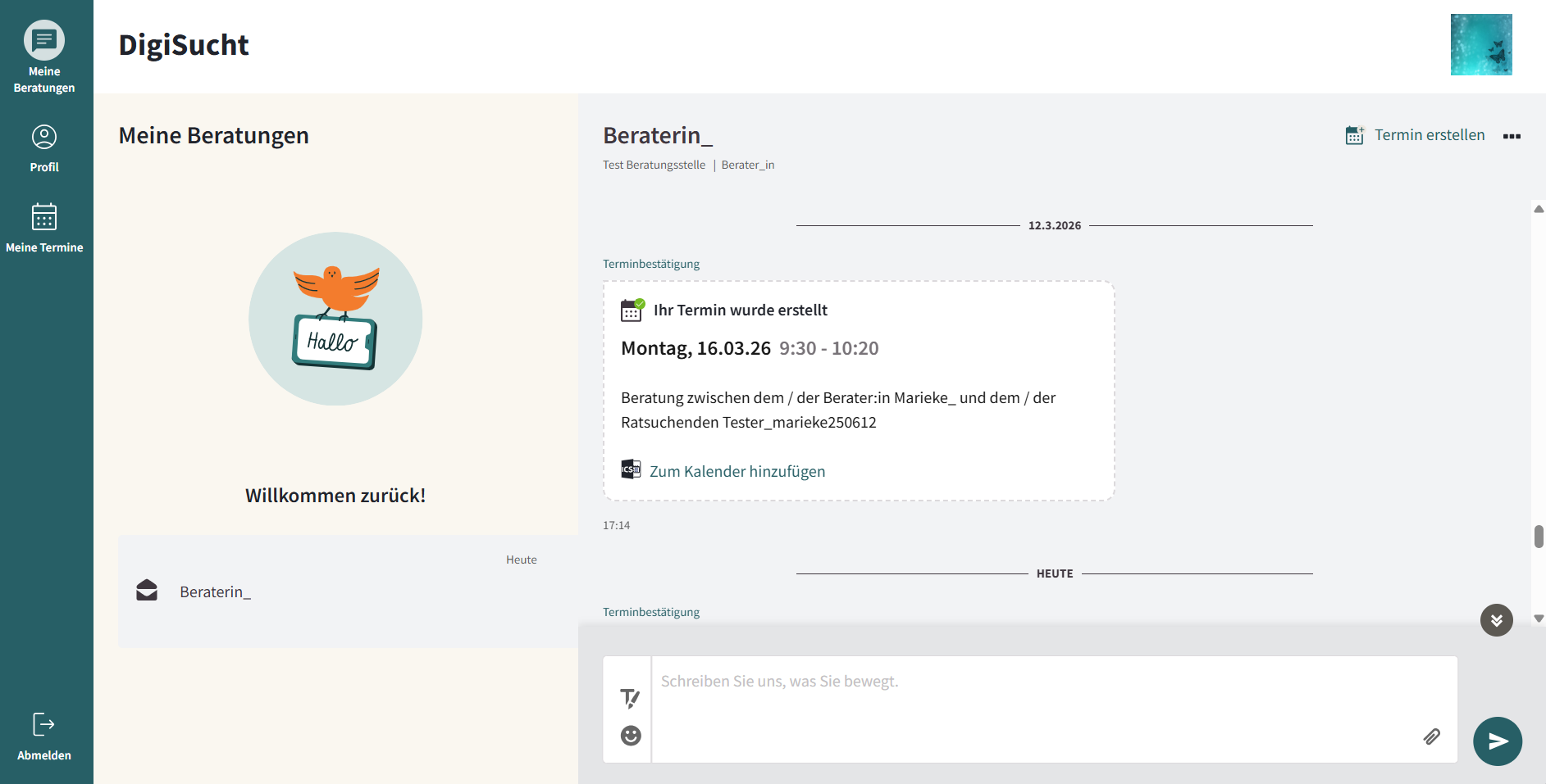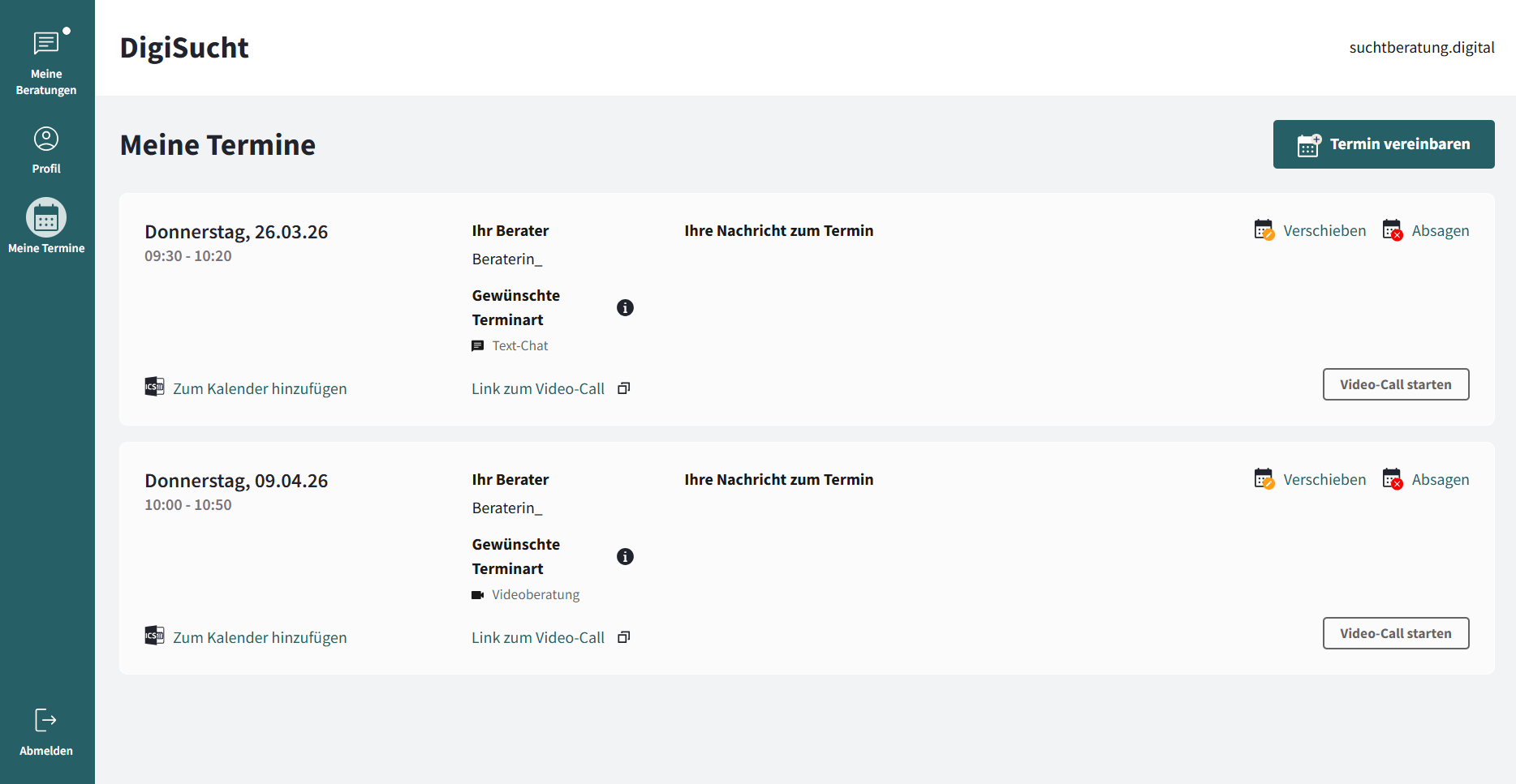 Die genaue Abstimmung zur Terminart (z.B. Text- oder Video-Chat) erfolgt über den Chat auf der DigiSucht-Plattform. Loggen Sie sich daher vor dem Termin noch einmal ein.